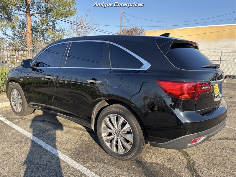 2014 Acura MDX SH-AWD w/Tech — Black exterior, Black interior. Powered by a 3.5L V6 with 290 hp and 267 lb-ft, mated to a 6-speed automatic and Acura’s Super Handling All-Wheel Drive. Factory equipment includes seating for seven with leather trim, power-adjustable front seats with driver memory and heated fronts, tri-zone automatic climate control, Tech Package features such as navigation with voice recognition and real-time traffic, rearview camera, Bluetooth hands-free and audio streaming, USB/AUX inputs and SiriusXM, premium ELS surround sound audio system, keyless entry with push-button start, alloy wheels, fog lights, and a full complement of safety features (ABS, traction control, Vehicle Stability Assist, and multiple airbags). This vehicle is in excellent overall condition.
