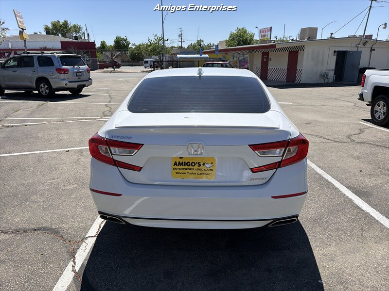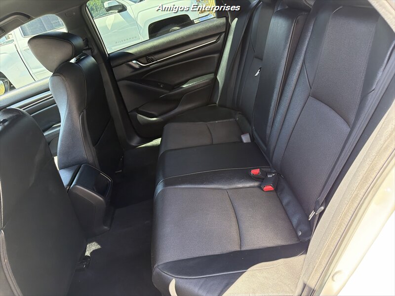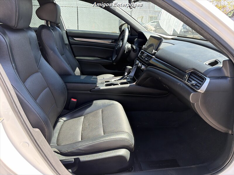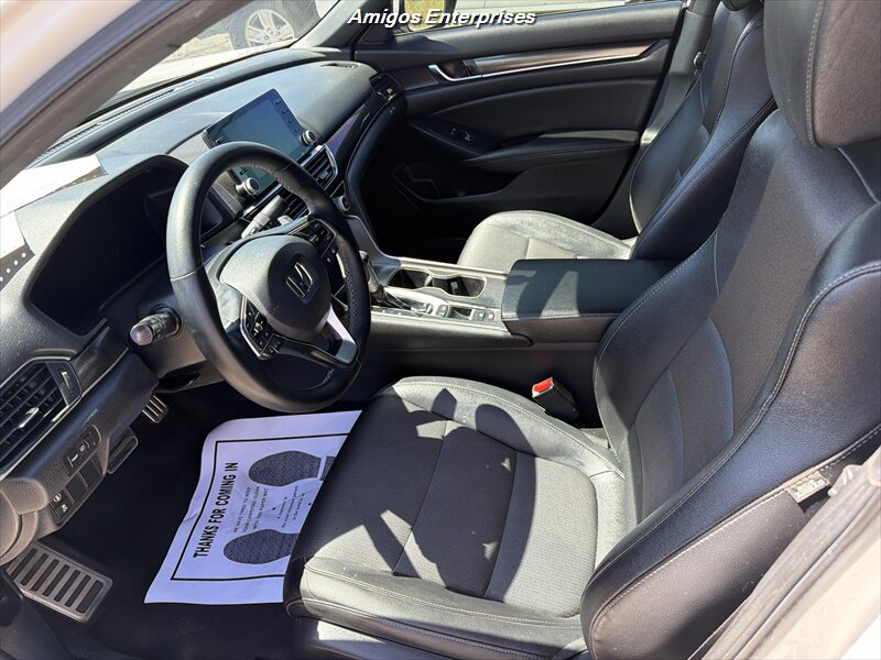 2019 Honda Accord Sport — Exterior blanco, interior negro. Motor 1.5L Turbo I4 (192 hp / 192 lb-ft) con transmisión CVT. El equipo de fábrica incluye pantalla táctil de 8 pulgadas con Apple CarPlay y Android Auto, Bluetooth y puertos USB, asientos deportivos de tela con buen apoyo lateral, arranque por botón y cierre remoto, climatizador automático de doble zona, control de crucero y controles de audio/teléfono en el volante, cámara trasera multiángulo, ABS, control de tracción y estabilidad, sistema completo de airbags y monitor de presión de neumáticos. Consumo: 29 MPG ciudad / 35 MPG carretera. Vehículo en excelente estado general — listo para conducir.